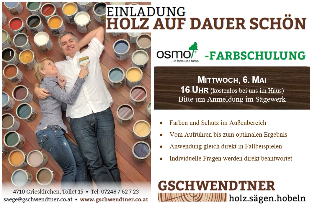 In unseren Hallen lagert eine breitgefächerte Auswahl an frischem Schnittholz und verschiedenen gehobelten Profilen, von Schrauben und Befestigungsmaterialien bis hin zu Farben und Pflege. Mit der Marke OSMO führen wir Holzanstriche auf natürlicher Öl- und Wachsbasis für Außen und Innen.